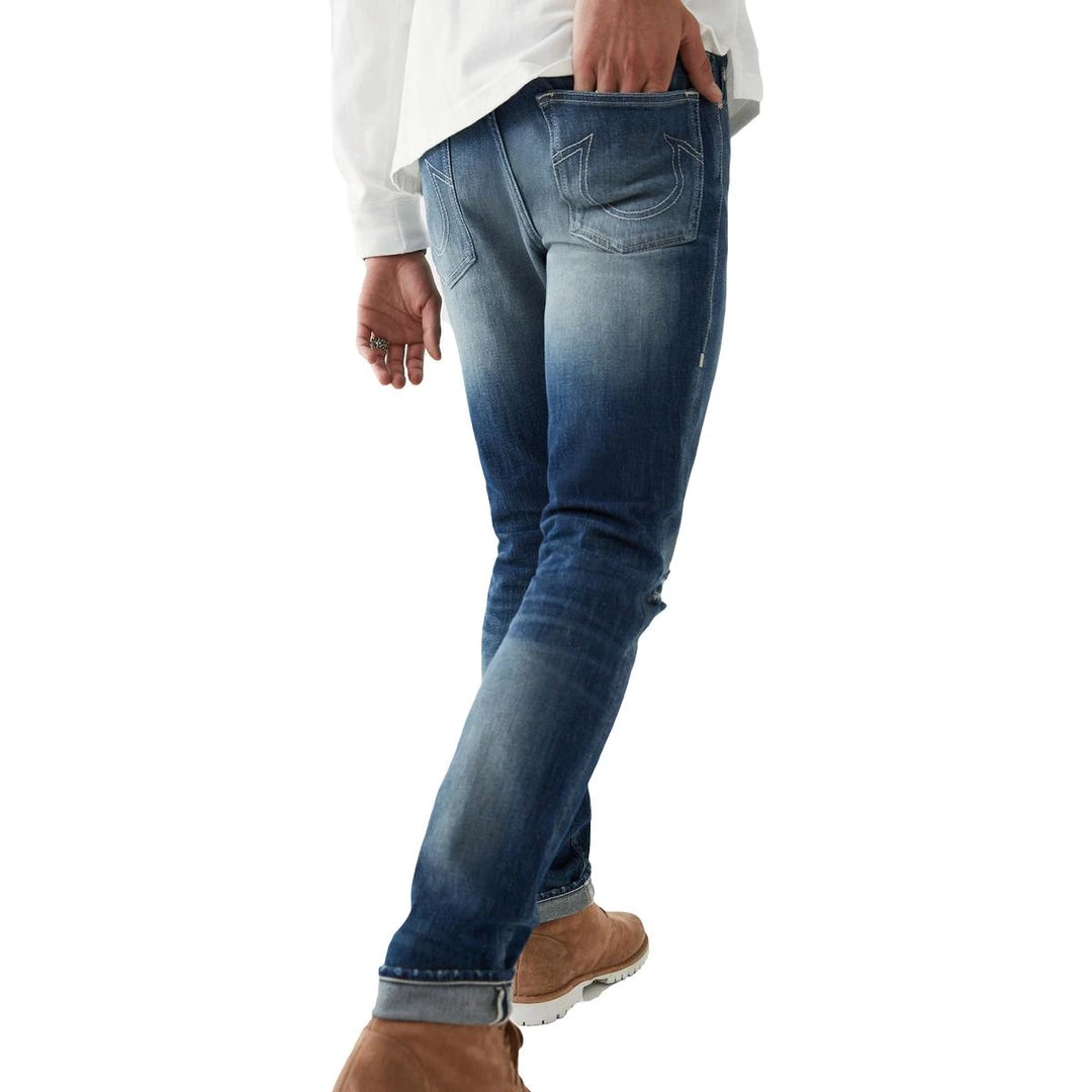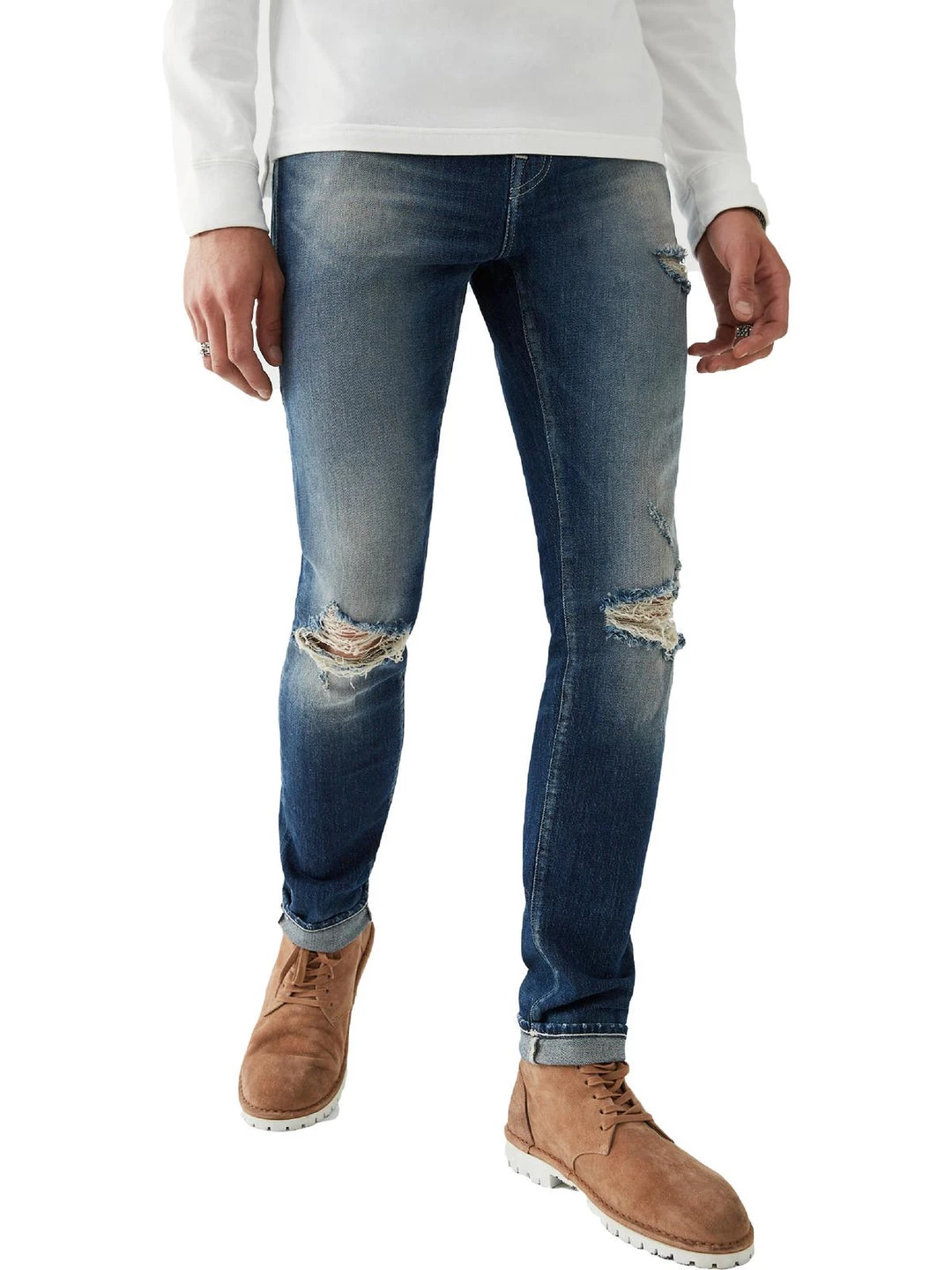 Step out in style in these distressed ultra skinny jeans by True Religion. Made with 98% cotton and 2% elastane. These jeans feature distinct fading, gentle whiskering, and destroyed details. They are finished off with a stitched horseshoe logo on back patch pockets. Their versatile design offers a bold, worn in look. Inseam – 34″. Button-zip fly. These jeans are guaranteed authentic.