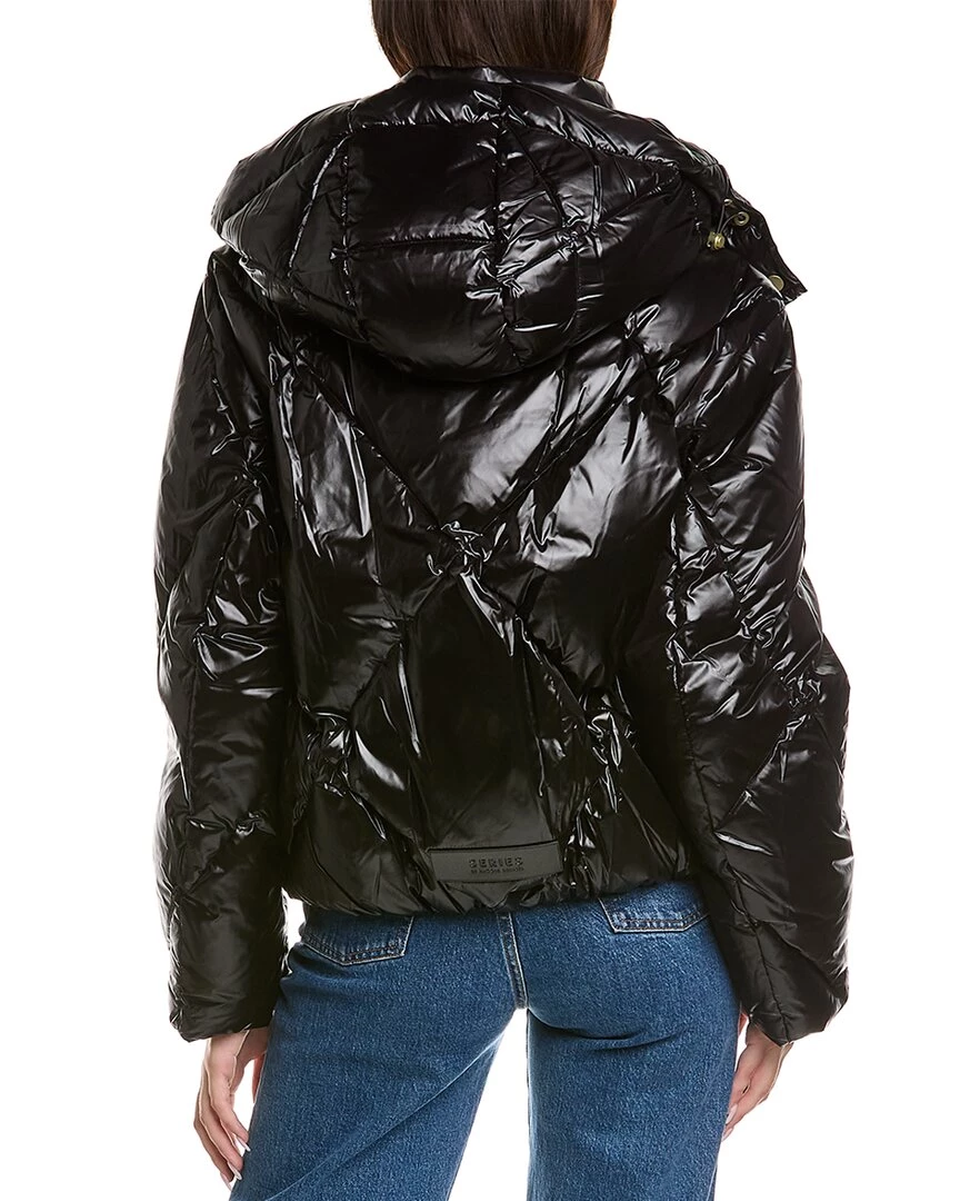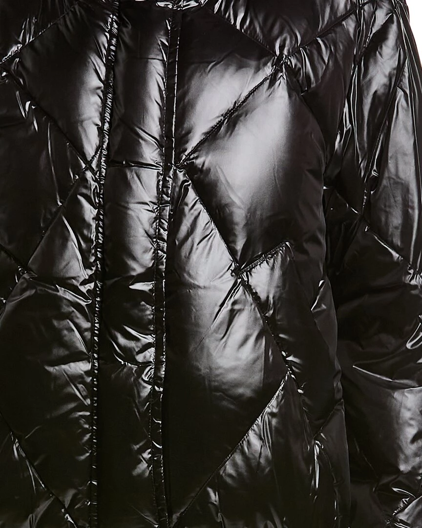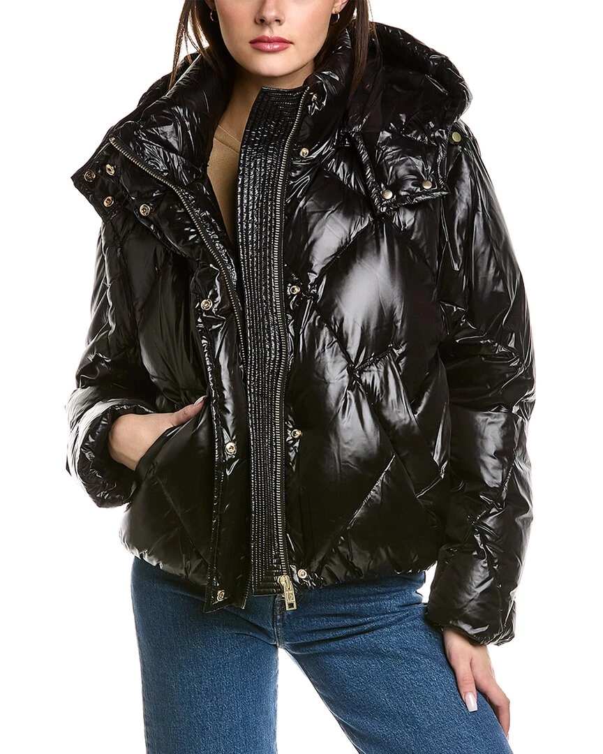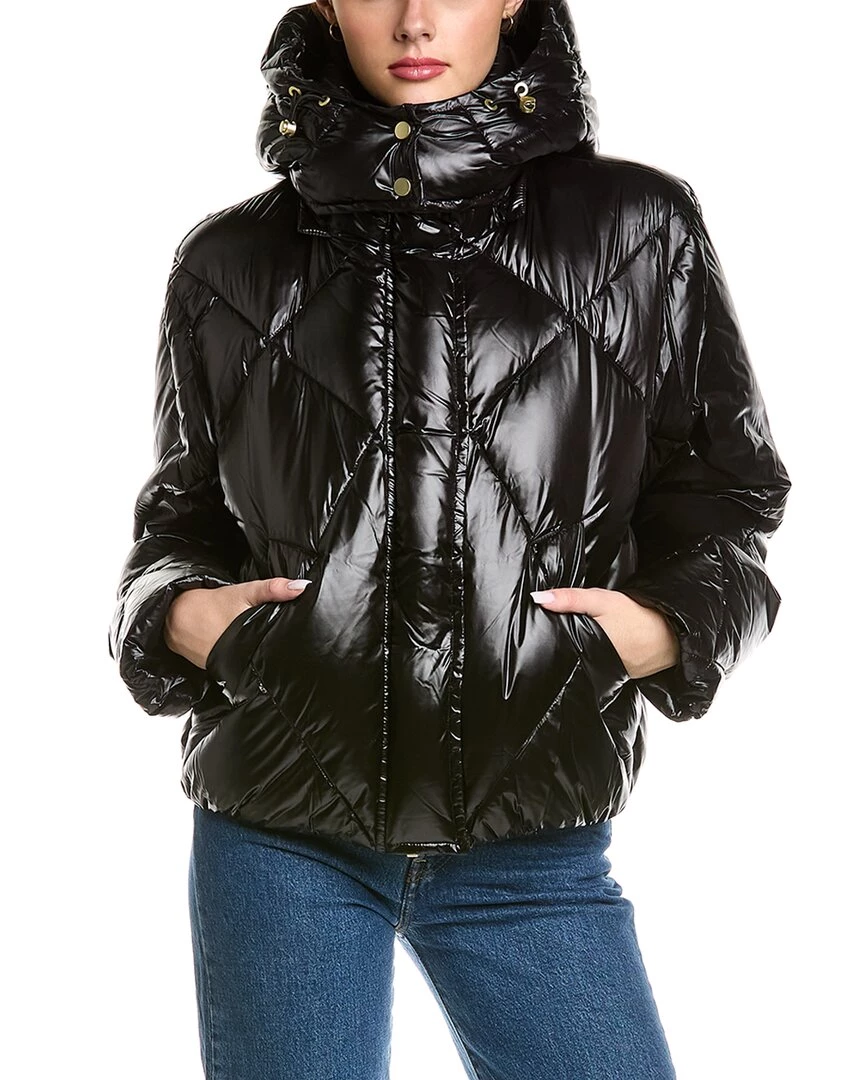 - Bea Quilted Down Coat In Black With Funnel Neck, Removable Hood, Two Front Pockets, And Elasticized Hem