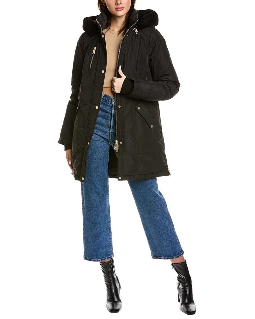 - Claremont Leather-Trim Down Coat In Black With Funnel Neck, Removable Hood, Fur And Leather Trim, Zippered Right Chest Pocket, Two Front Pockets, Inner Rib Cuffs, Zippered Side Slits At Hem, And Quilted Lining