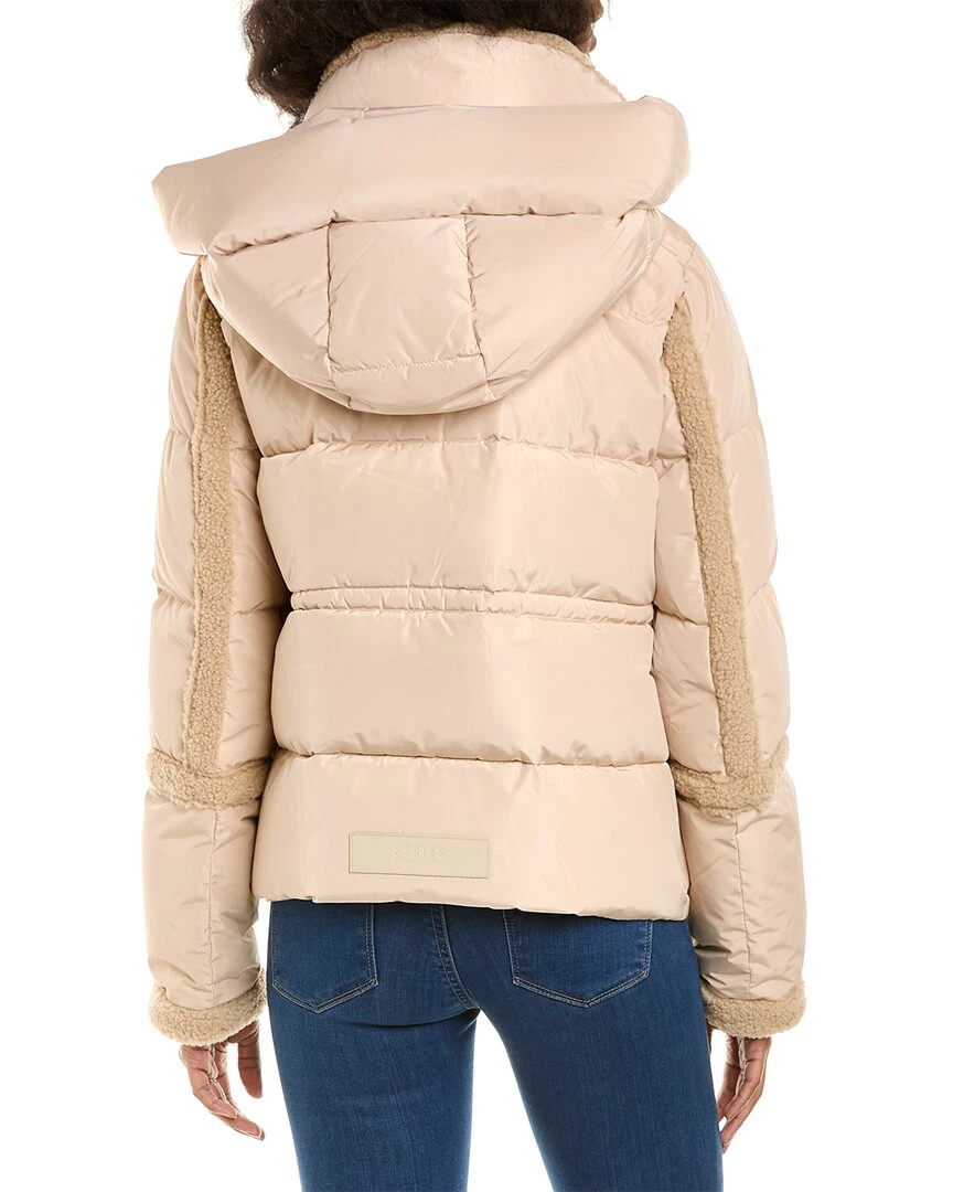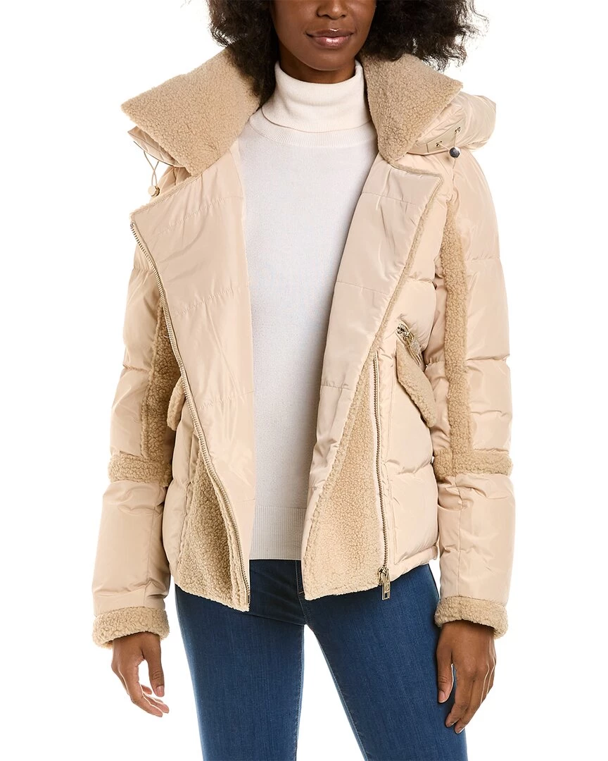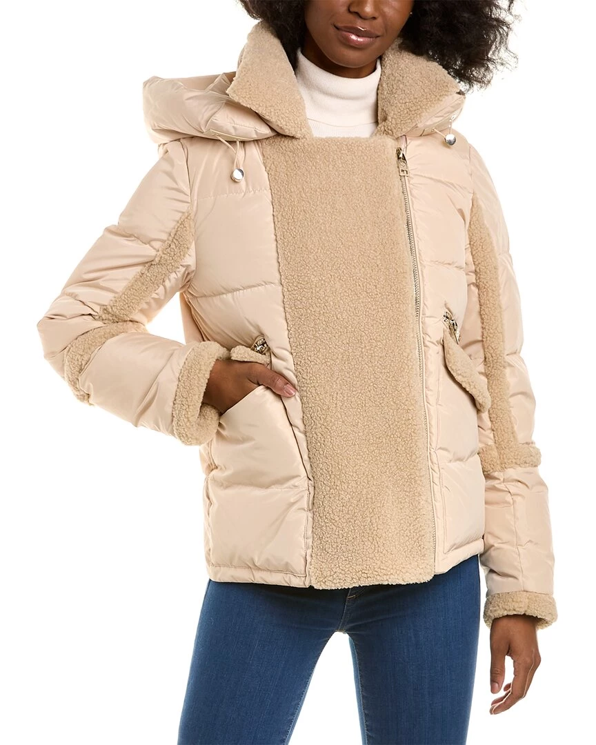 - Geilo Down Coat In Beige With Quilted Design, Removable Hood, Faux Sherpa Paneling, Two Zippered Front Pockets, And Two Front Flap Pockets