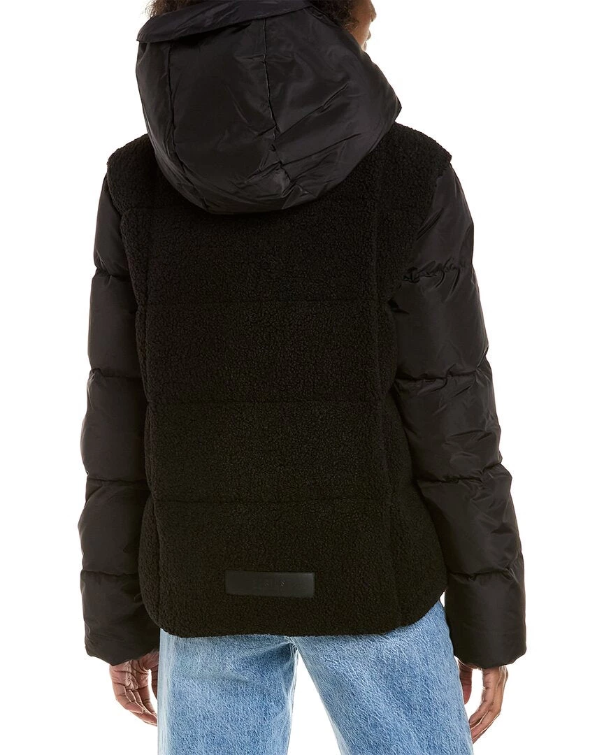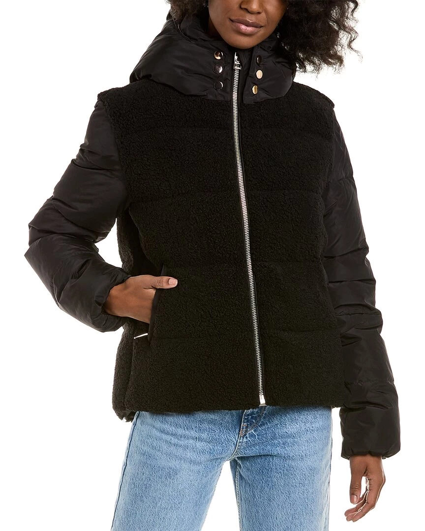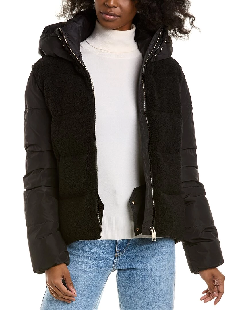 - Isere Down Coat In Black With Quilted Design, Faux Sherpa Paneling, Funnel Neck, Removable Hood, Two Zippered Front Pockets, Inner Snowskirt, Slight High-Low Hem, And Drawcord At Hem