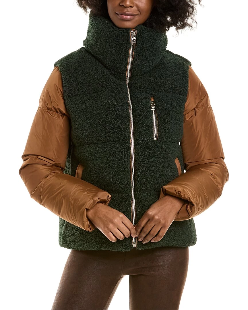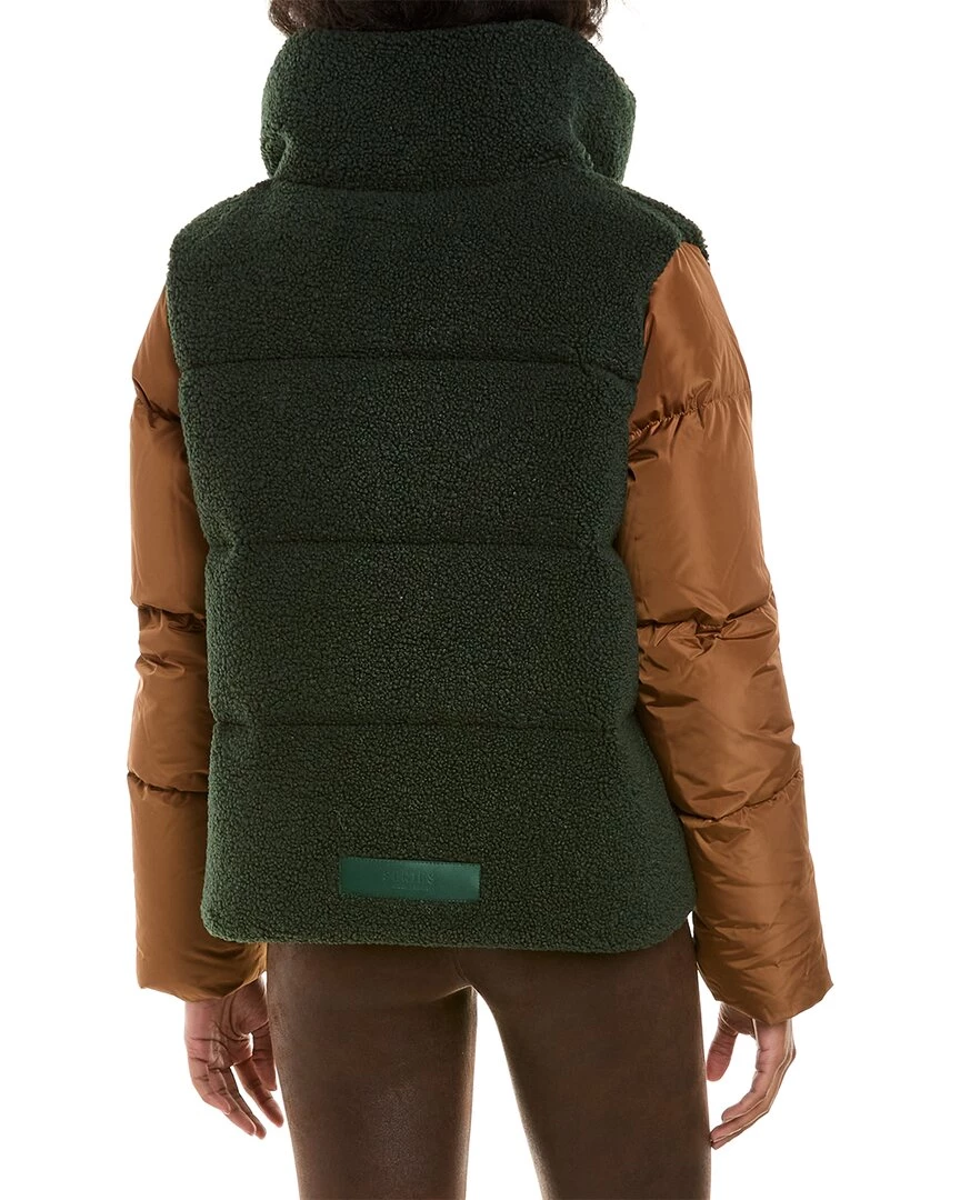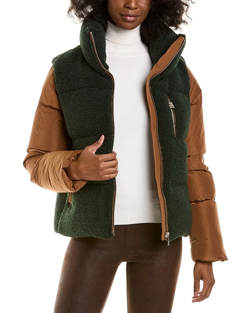 - Jasper Down Coat In Olive And Cinnamon With Faux Sherpa Paneling, Funnel Neck, Zippered Left Chest Pocket, Two Front Pockets, And Drawcord At Hem