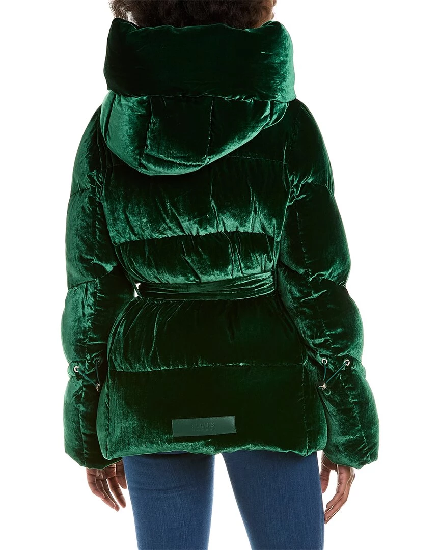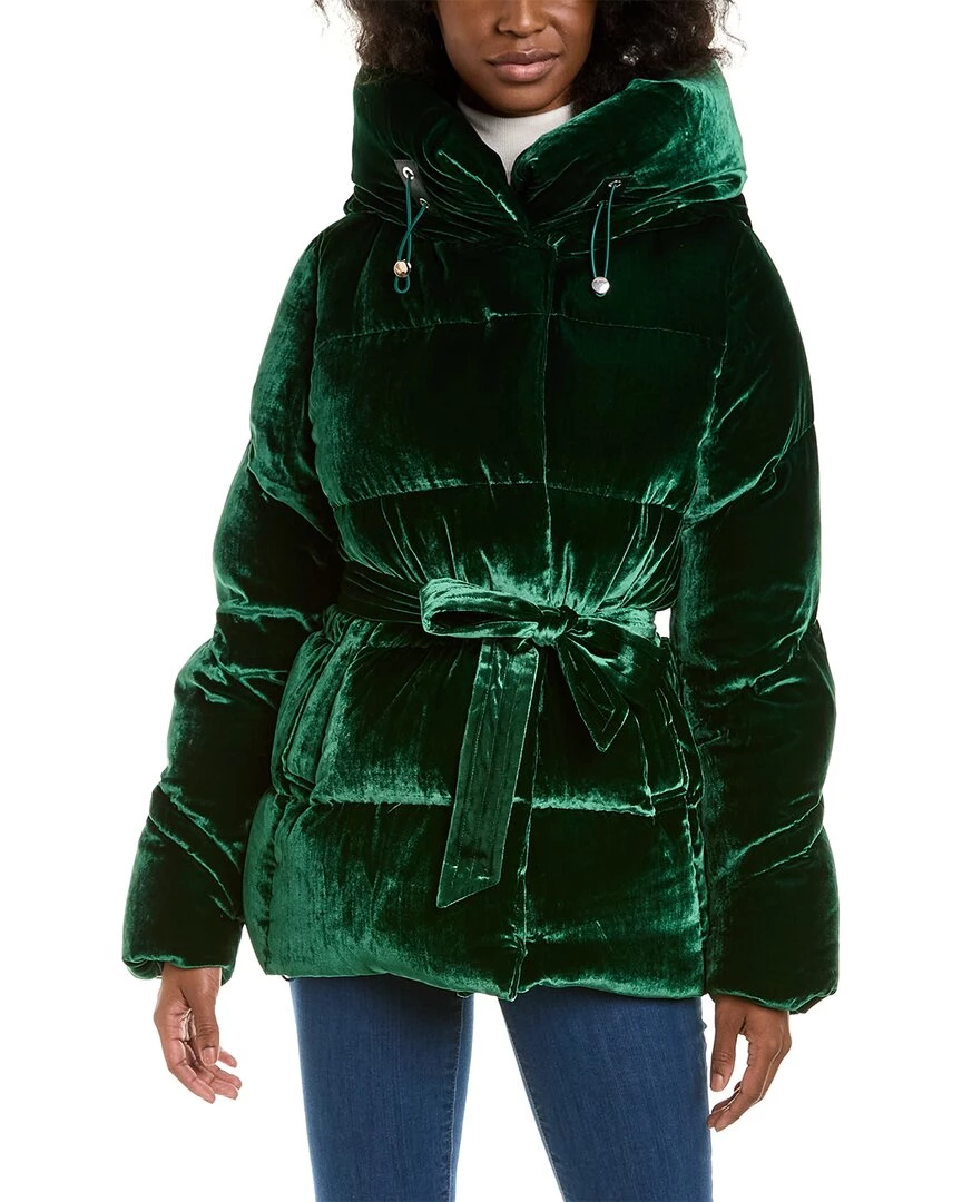- New Kitz Velvet Silk-Blend Down Coat In Pine With Oversized Hood, Barrel Quilted Design, Two Front Pockets, Drawcords At Sleeves, And Tie Belt At Waist