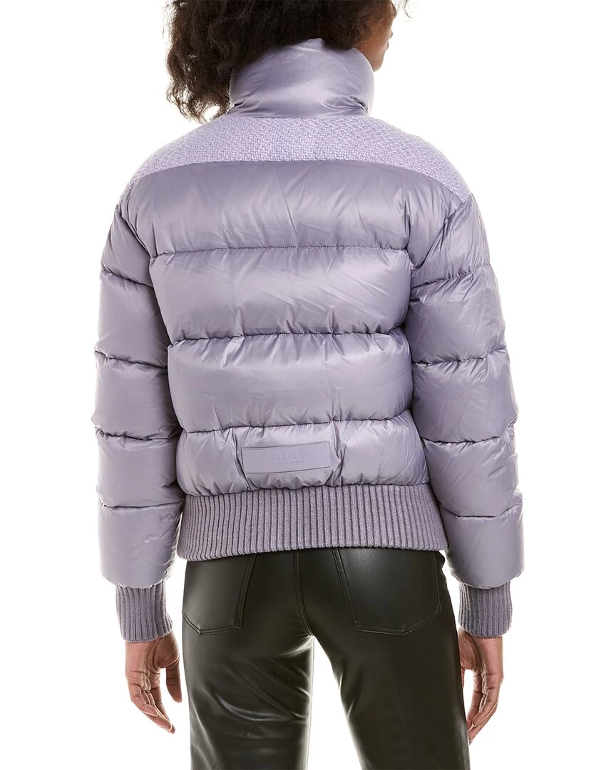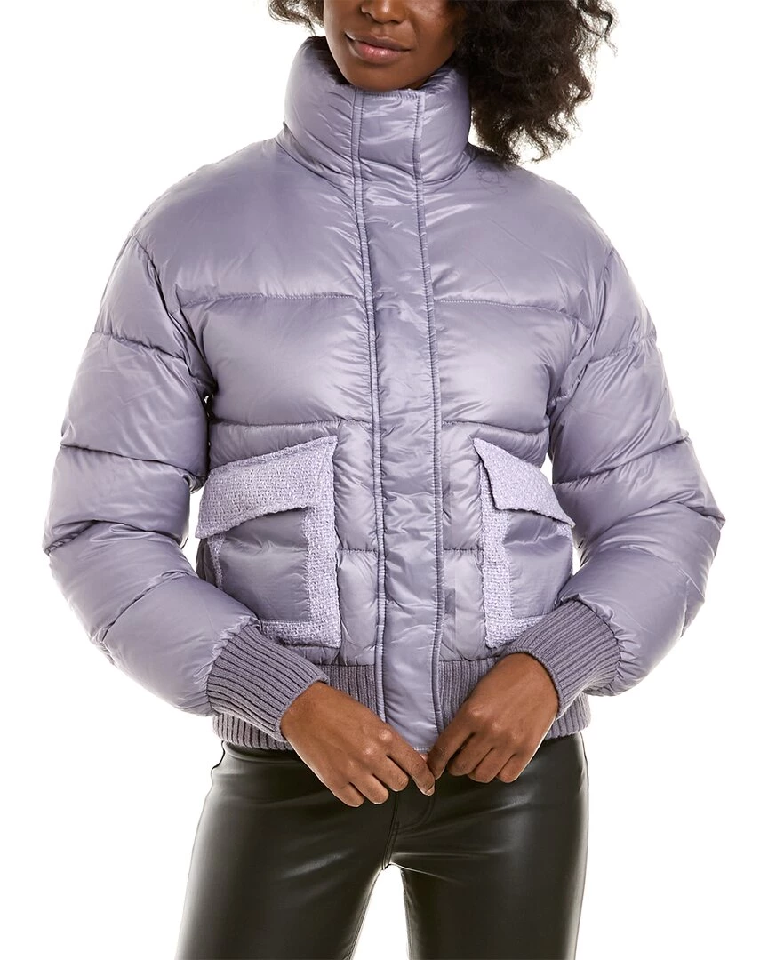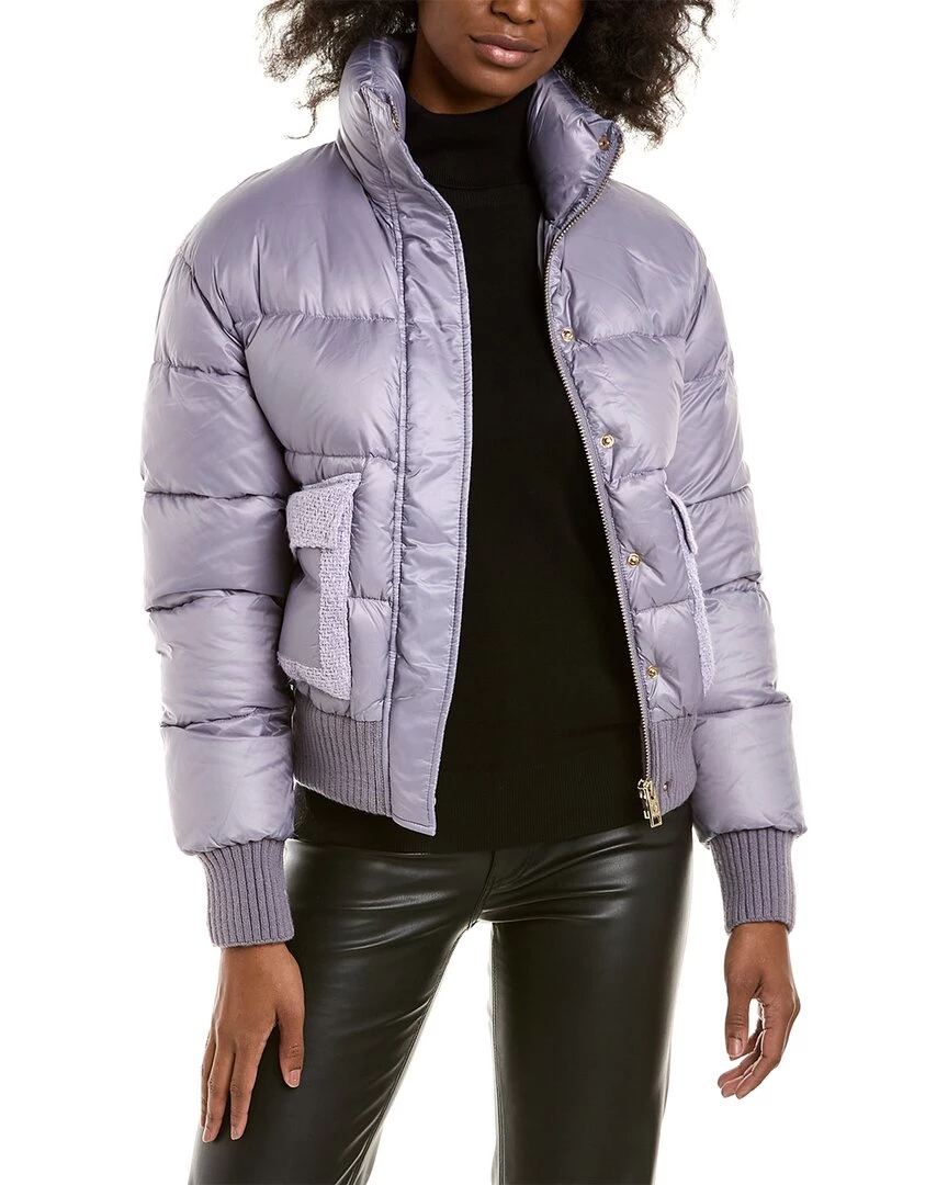 - Snowflake Down Coat In Lavender Grey With Quilted Design, Funnel Neck, Tweed Trim, Two Front Pockets, And Rib Knit Trim